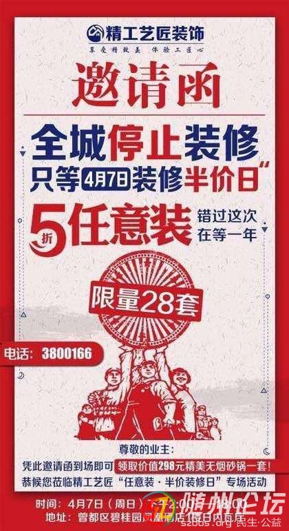 家裝福利來了 隨州電視臺(tái)聯(lián)合建行 4月7日本周日在 碧桂園鳳凰大酒店 裝修半價(jià), 你沒有看錯(cuò), 就是裝修半價(jià) 立省幾萬元。 有時(shí)間的可以來看看 更有免費(fèi)禮品贈(zèng)送! 報(bào)名電話:18008665186 ...