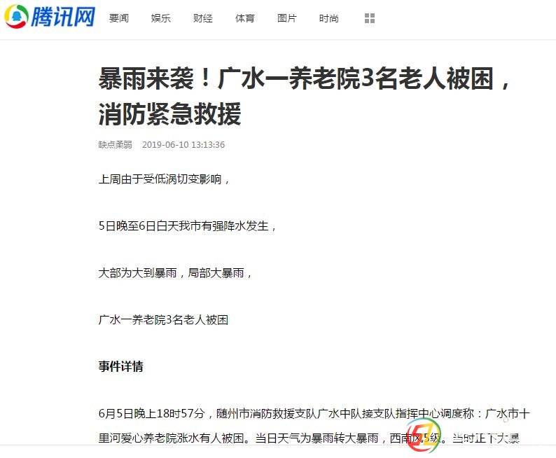 事件詳情 6月5日晚上18時(shí)57分,隨州市消防救援支隊(duì)廣水中隊(duì)接支隊(duì)指揮中心調(diào)度稱:廣水市十里河愛(ài)心養(yǎng)老院漲水有人被困。當(dāng)日天氣為暴雨轉(zhuǎn)大暴雨,西南風(fēng)5級(jí)。當(dāng)時(shí)正下大暴雨,流水湍急。天色較暗,視線很差, ...