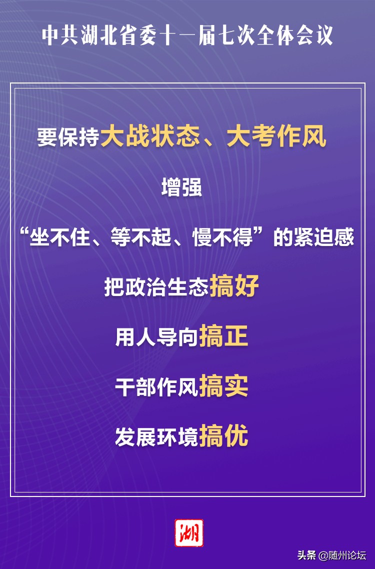 6月10日,湖北舉行省委十一屆七次全會(huì),會(huì)議強(qiáng)調(diào),當(dāng)前湖北各方面工作任務(wù)很重、困難很多,全體干部要保持大戰(zhàn)狀態(tài)、大考作風(fēng),真抓實(shí)干、奮力拼搏,堅(jiān)決完成好各項(xiàng)工作任務(wù)。 # \ V9 |+ ...